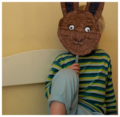 Paashaas sjmaashaas, denkt Peuter. En dit prachtige *kuch* masker is dan ook geen paashaas een konijntje. Een klein konijntje dat, net zoals Peuter toevallig, gèk is op rauwe worteltjes. En worteltjes schijnen goed te zijn voor de ogen. Dus misschien dat ’t dan nog goed komt met dit konijntje.